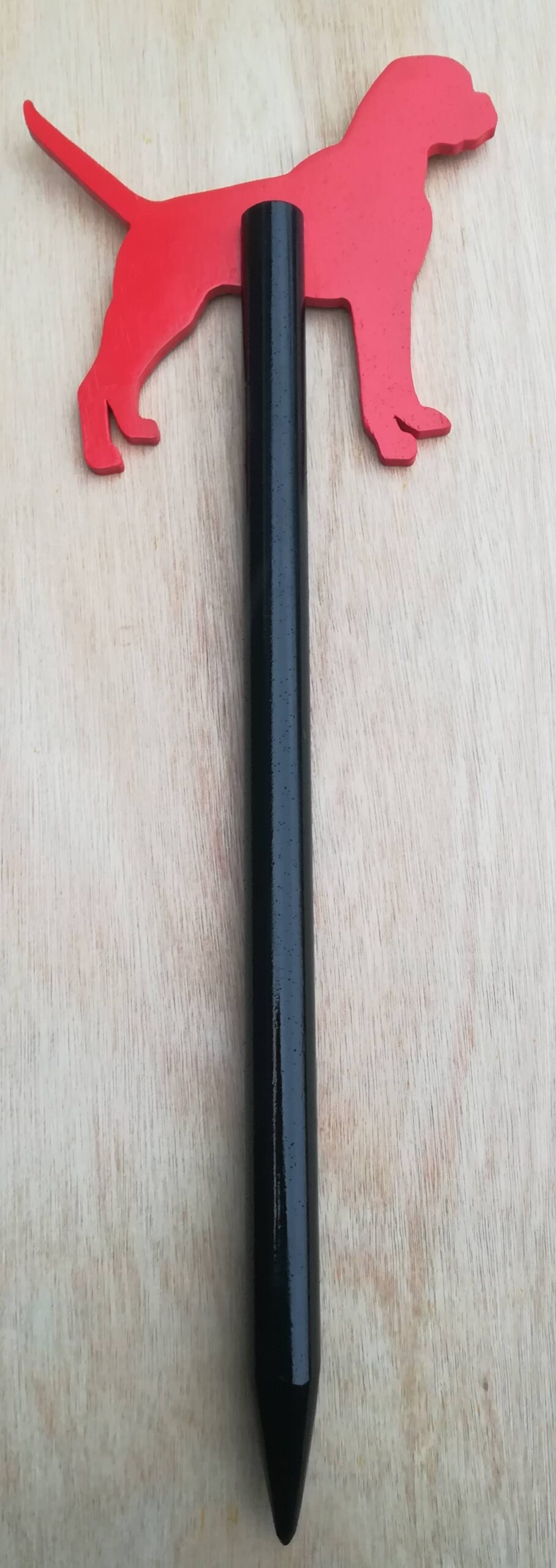 van hout gemaakte speurpaal van een Boxer.