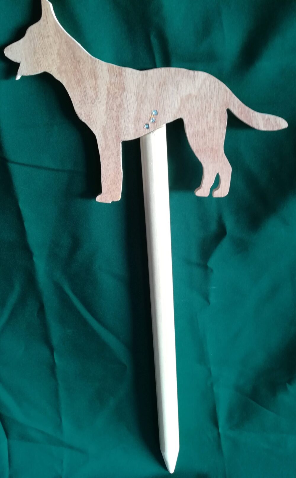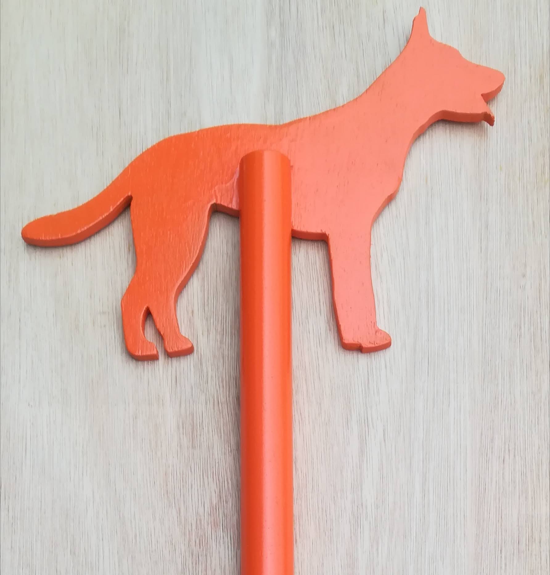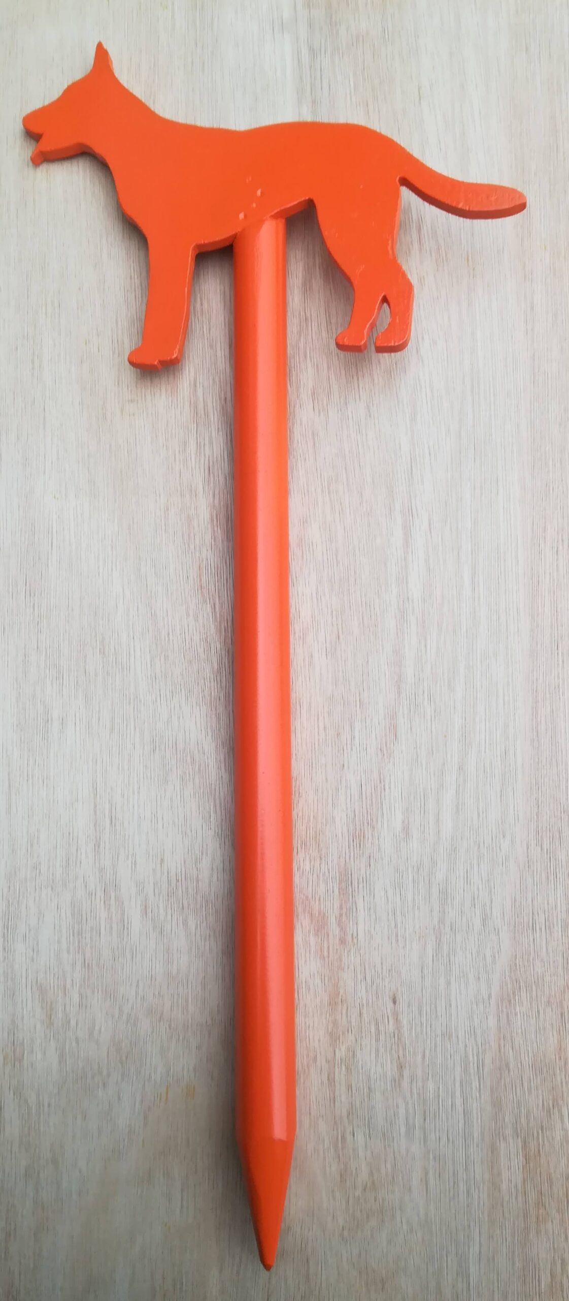 van hout gemaakte speurpaal van een Hollandse Herdershond.