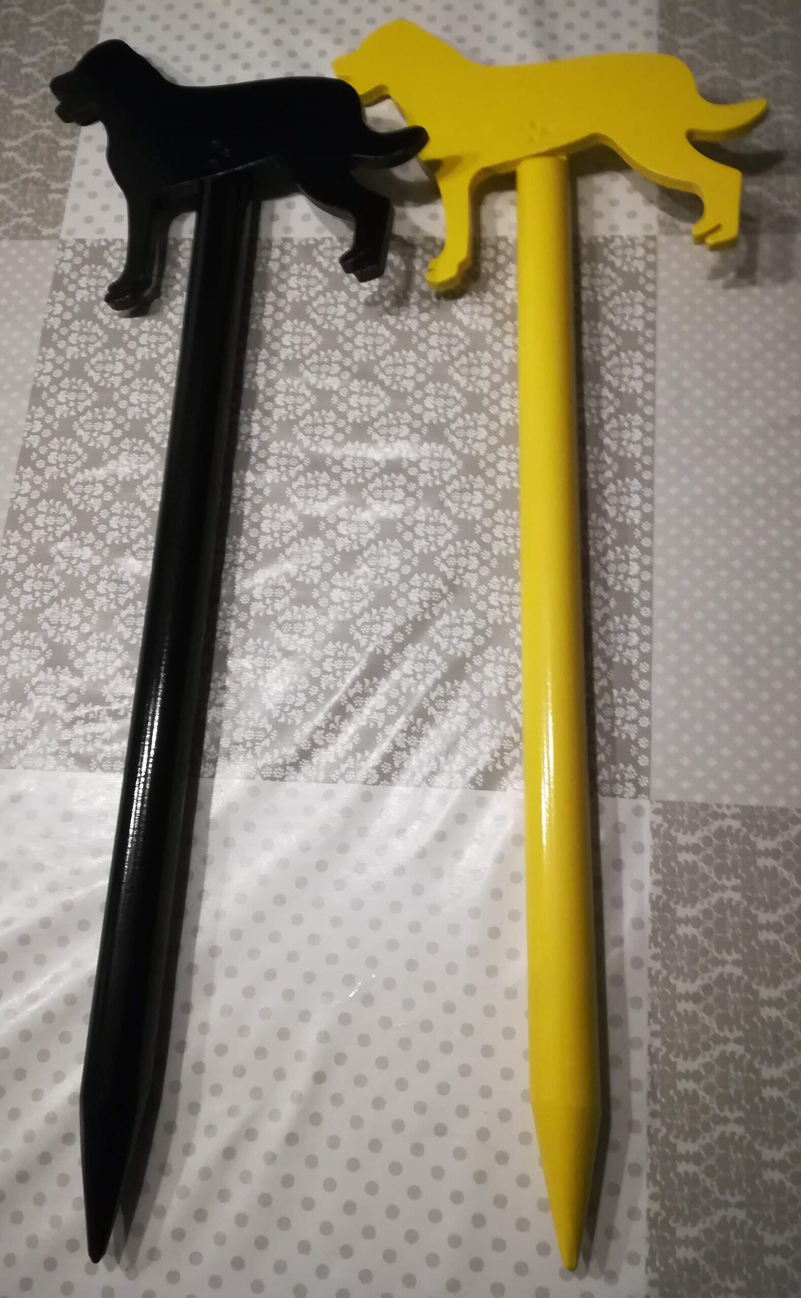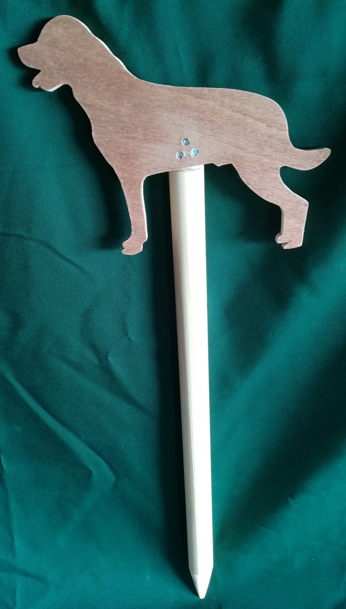 van hout gemaakte speurpaal van een Rottweiler zonder oortjes.